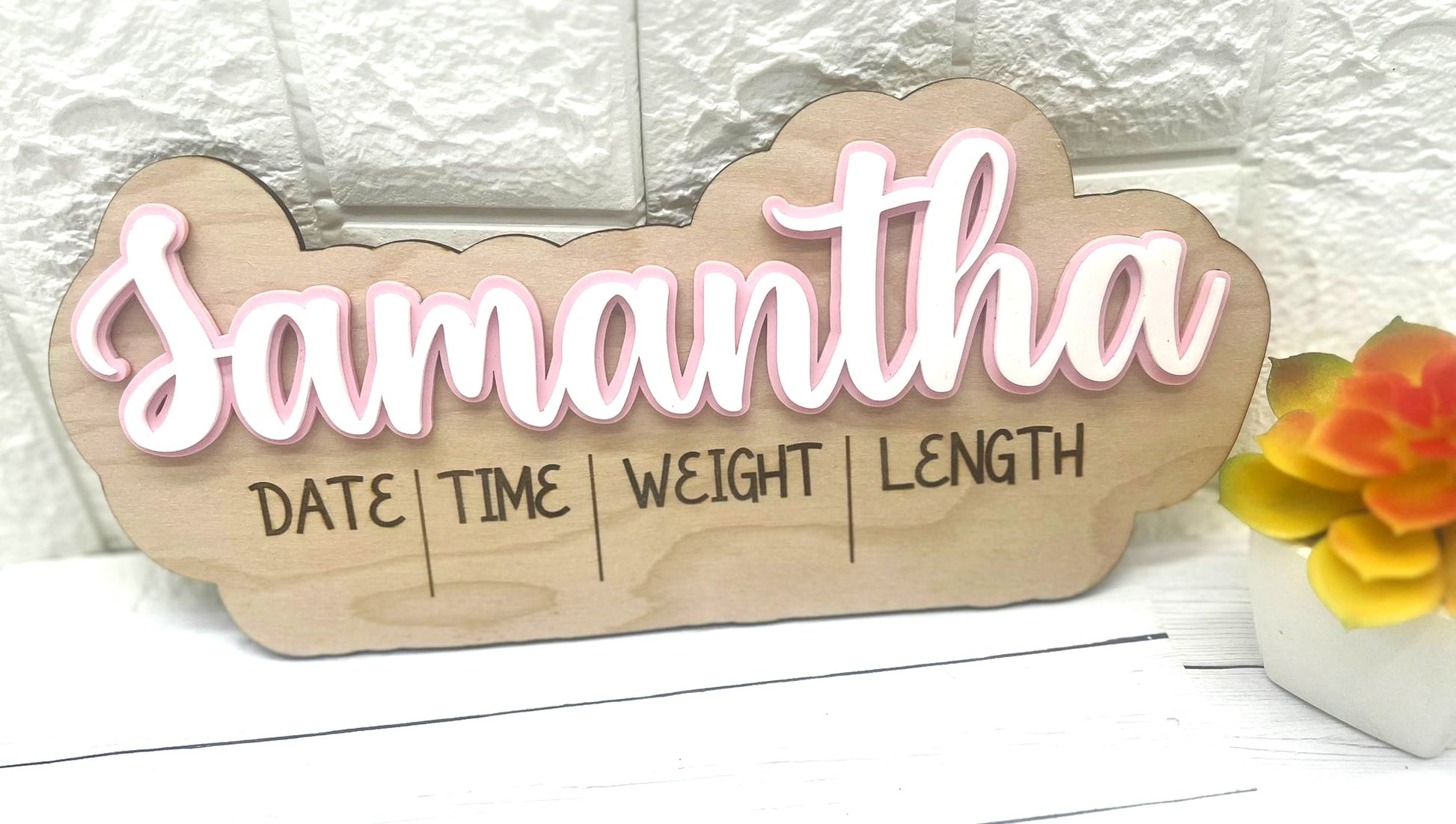 We make birth announcements super easy for our round birch wood baby name signs. You can jot down your newborn baby's birth details, place the wood disc next to baby and snap a picture. Send to family and friends or post on social media for a quick, but memorable way to let the world know your little one has arrived! We laser engrave the statistic lines with two lines and then use a bright acrylic to top the hospital sign off with baby's first name. Keep this sweet keepsake in the nursery as a piece of decor.